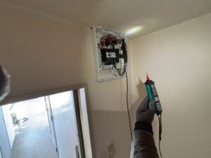 現地確認を行うと、同じマンション内で複数の住戸にてブレーカーが正常に作動しない状態となっていました。